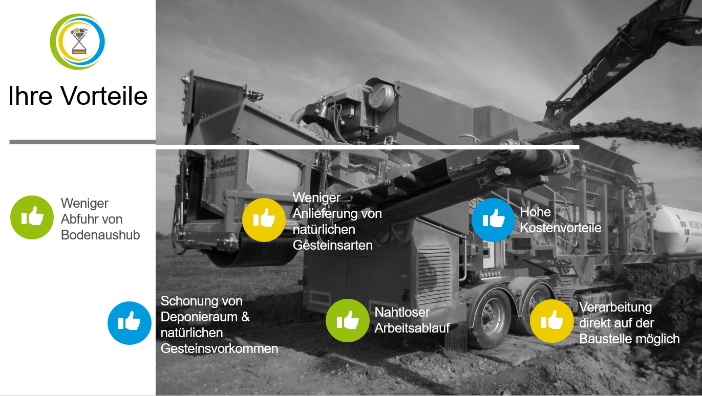 Die mengenmäßig stärksten Abfallströme in Deutschland pro Jahr sind Boden & Steine (109,8 Mio. t.), sowie Bauschutt (51,6 Mio. t.). Lediglich 9,8% werden recycelt und dem Stoffkreislauf zugeführt.